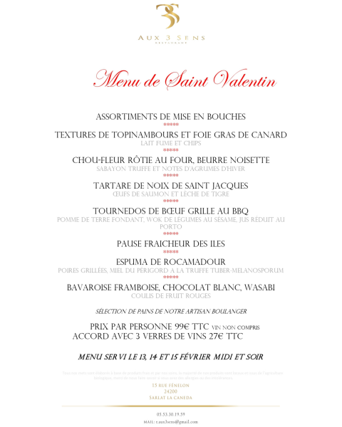 Nous sommes ravis de vous annoncer que notre restaurant Aux 3 Sens est prêt à vous accueillir pour célébrer la Saint Valentin avec un menu exceptionnel à 99€, servi les 13, 14 et 15 février, soir. Venez savourer des plats raffinés tels que des textures de Topinambours, Truffes et Foie Gras de Canard, des Noix de Saint Jacques, ou encore un Tournedos de Bœuf grillé au BBQ, accompagnés de notre sélection de vins.